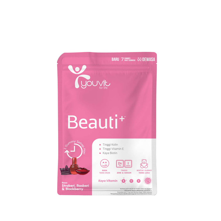 YOUVIT Beauti+ merupakan vitamin untuk merawat kecantikan kulit, rambut, dan kuku dari dalam. Kombinasi kandungan Inositol + Kolin, Vitamin E, dan Zinc di dalamnya berfungsi mencegah penuaan dini, menguatkan dan mengembalikan kilau rambut, serta menguatkan dan menyehatkan kuku. Tersedia dalam rasa buah berry yang lezat dan hadir dalam tiga bentuk cantik nan menggemaskan, yaitu lipstik, mahkota, dan botol parfum.