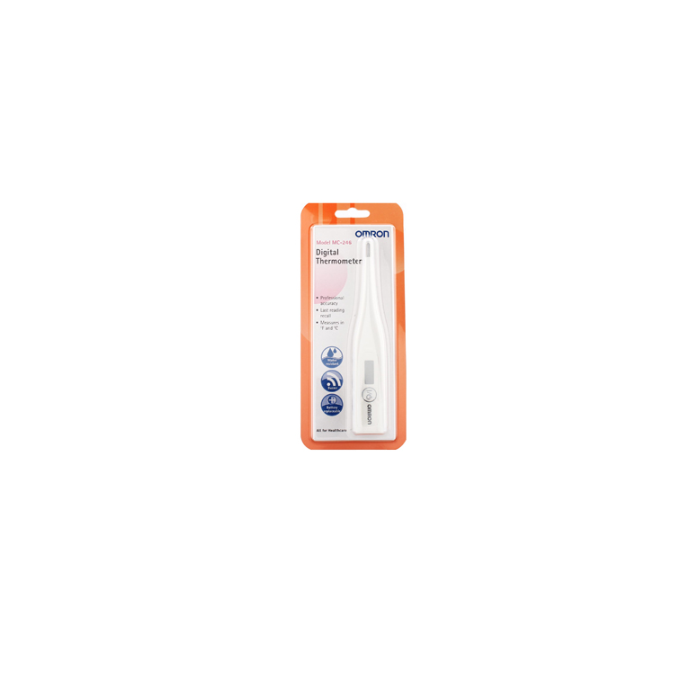 OMRON DIGITAL THERMOMETER MC-246 merupakan alat pengukur suhu tubuh digital dengan layar LCD untuk menampilkan hasil pengukuran yang menawarkan akurasi, keamanan dan kecepatan dalam pengukuran temperatur. Alat ini menawarkan pengukuran aktual yang cepat, yaitu: 80 detik jika melalui mulut, 60 detik jika melalui dubur, dan 120 detik jika melalui ketiak. Selain itu, Omron digital termometer memiliki fitur sebagai berikut: - Mengukur suhu aktual dalam C and F. - Memori penyimpanan hasil pengukuran suhu terakhir. - Tahan air sehingga mudah dibersihkan. - Buzzer: dapat berbunyi ketika pengukuran telah selesai. - Baterai dapat diganti.