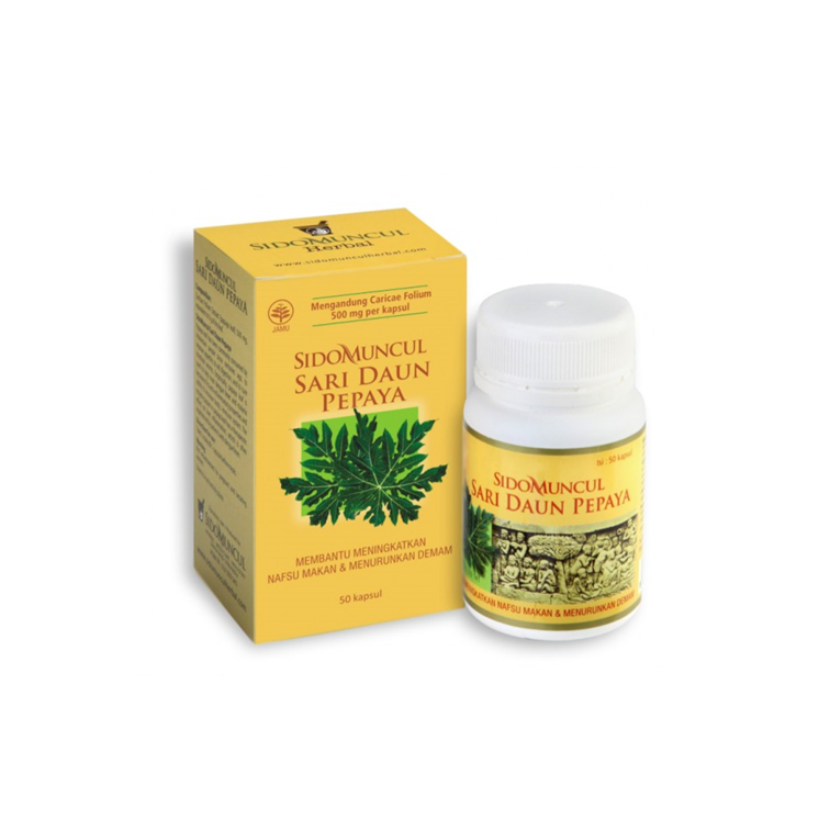 Sido Muncul Sari Daun Pepaya merupakan suplemen herbal yang dibuat dari ekstrak daun pepaya dan bermanfaat untuk memebantu mengatasi demam, demam berdarah, malaria, cacingan, serta meningkatkan nafsu makan.